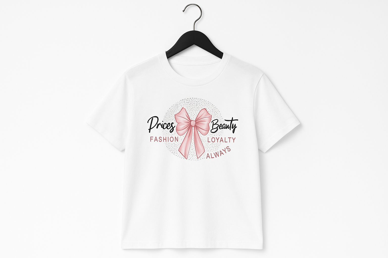 Elegante camiseta blanca personalizada con diseño exclusivo 'Pricey Beauty Fashion Loyalty Always' decorada con un hermoso lazo rosa y detalles brillantes.