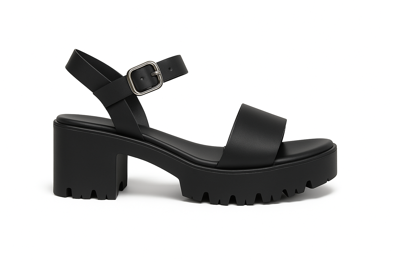 Sandalias negras elegantes con plataforma y suela tipo track, perfectas para un look moderno y sofisticado. Su color negro las hace versátiles para cualquier ocasión.